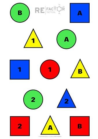 The IQ Target is designed to create thinking among shooters. The infinite combination of shapes, colors, numbers and letters allows an instructor or student to create a wide variety of shooting problems. Students can be given simple commands such as “shoot all the triangles” or more complex scenarios such as “shoot at the squares and triangles that contain a number.”